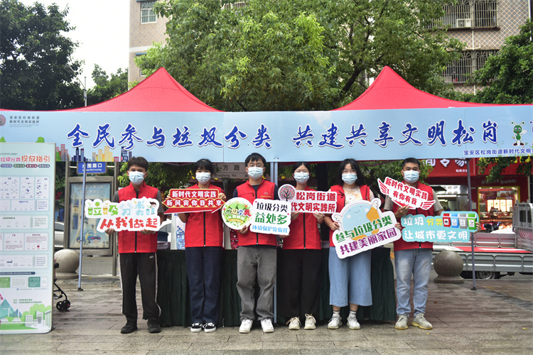垃圾分类与每个市民的生活息息相关。近年来,松岗街道充分发挥基层党组织和党员在推进垃圾分类工作中的先锋示范作用,以“红色力量引领绿色生活”,组织党员、志愿者参与站桶督导、现场讲解,持续推动垃圾分类触角向居民小区延伸。与此同时,松岗街道还定期组织社区新时代文明实践站的工作人员,到社区小区广场,开展垃圾分类知识科普,提升居民垃圾分类意识。