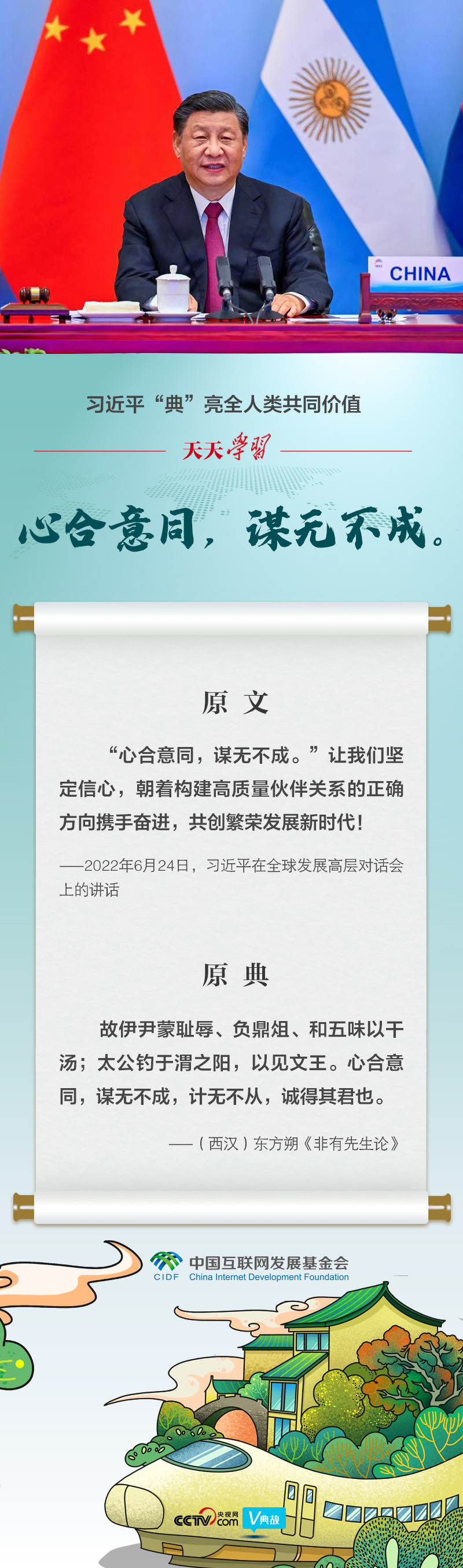 6月24日晚,习近平主席在北京以视频方式主持全球发展高层对话会,并发表题为《构建高质量伙伴关系 共创全球发展新时代》的重要讲话。习主席指出:“这是一个充满挑战的时代,也是一个充满希望的时代。我们要认清世界发展大势,坚定信心,起而行之,拧成一股绳,铆足一股劲,推动全球发展,共创普惠平衡、协调包容、合作共赢、共同繁荣的发展格局。”在讲话的最后,习主席引用古语“心合意同,谋无不成”,豪情满怀地向世界发出号召:“让我们坚定信心,朝着构建高质量伙伴关系的正确方向携手奋进,共创繁荣发展新时代!”