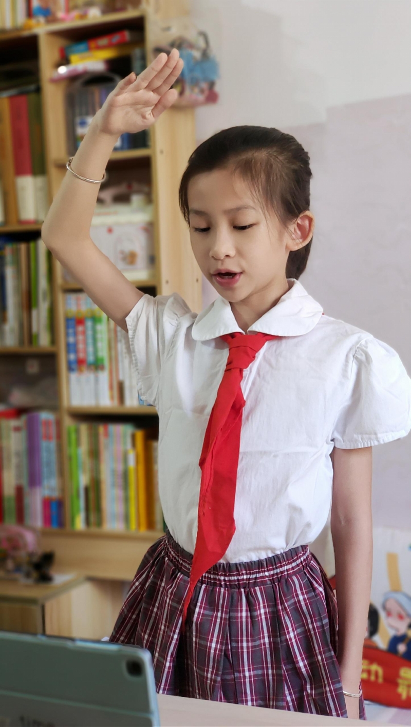 早上8:30,学校进行了云端升旗仪式,同学们在家里身穿夏季礼服、少先队员佩戴好红领巾隔屏参加了庄严的升旗仪式。