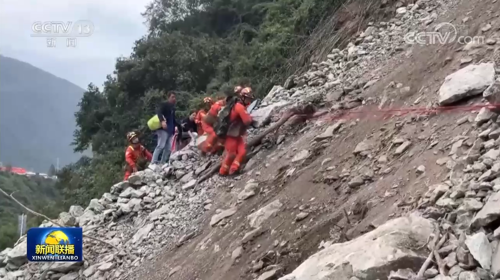 在海螺沟景区通往磨西镇的路上,近70名救援人员和8名群众被地震造成的滑坡阻挡。救援人员拉起绳索,在垂直山体上踩出一条“路”,护送被困群众。