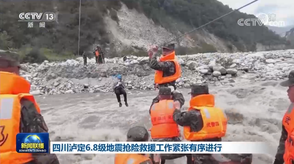 位于震中泸定县磨西镇燕子沟一侧的共和村因道路、桥梁中断成为“孤岛”。武警战士们和重庆来的应急救援队一道,利用绳索拉起空中救援通道,转移被困人员。先后有31名群众通过溜索转移到安全区域。