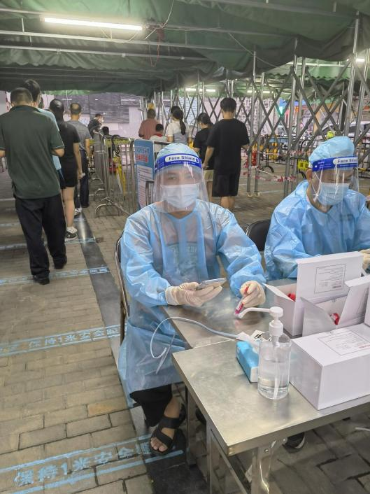 景旺电子股份有限公司党支部组织委员王天池同志带领本支部发展党员林风怡支援铁岗社区核酸检测工作