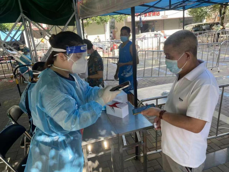 铁岗社区“两新”联合党支部李茂同志在给社区居民扫核酸码