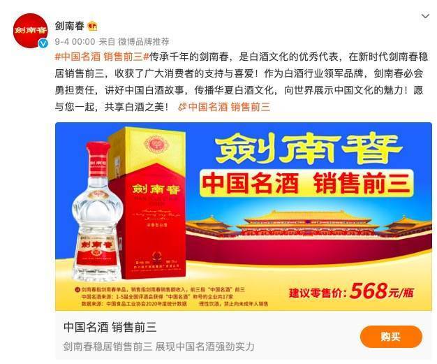 与此同时,南都湾财社记者还看到,剑南春的新浪微博上,仍挂有“名酒销售前三”的相关话题页及形象展示。