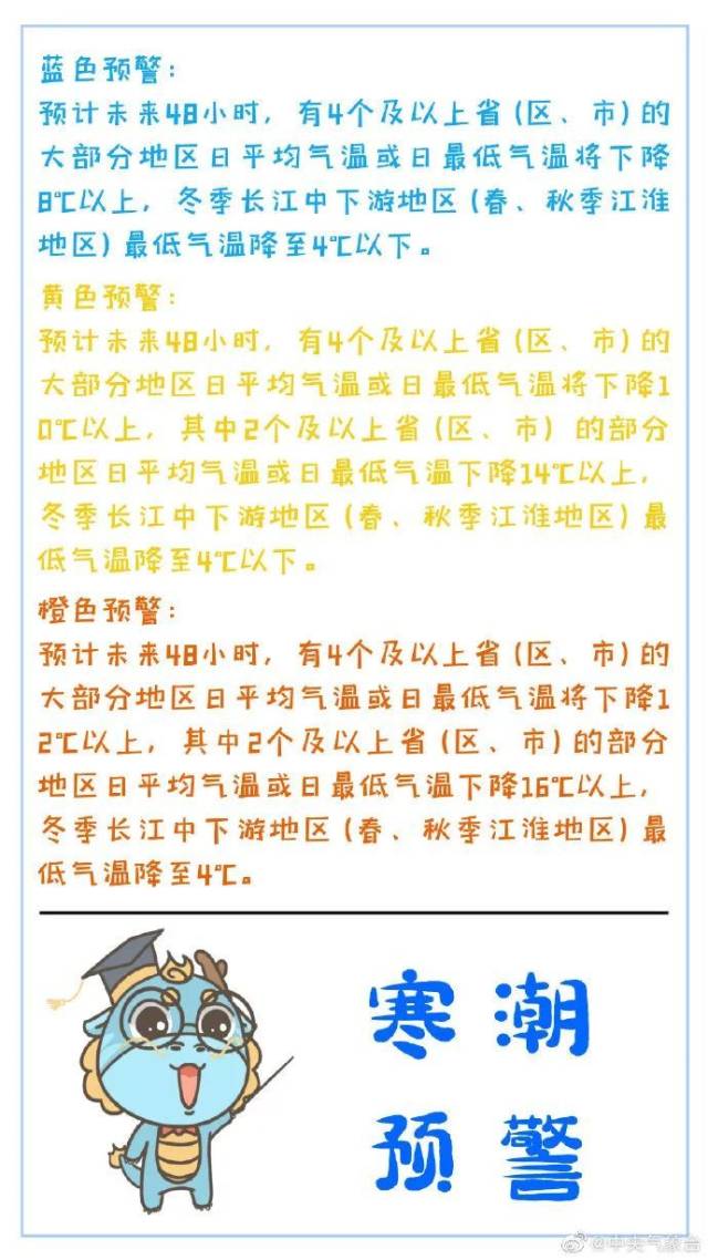 寒潮预警由弱至强分别有:蓝色预警、黄色预警和橙色预警,对影响范围、降温幅度、最低气温等进行了规定。