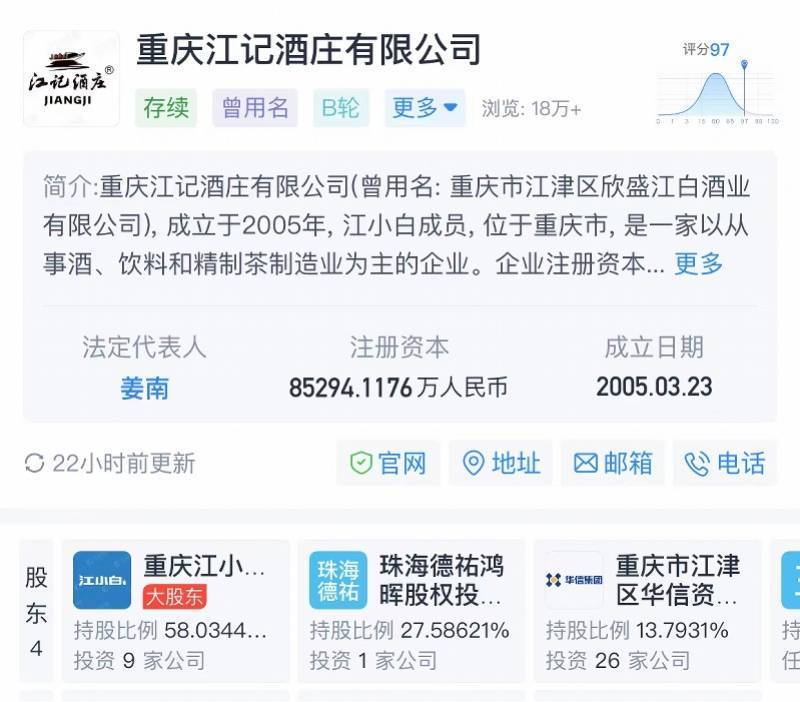 10月21日,市场传出江小白控股的江记酒庄获得国资入股,天眼查数据显示,江记酒庄股东确实已发生变动,重庆市江津区华信资产经营(集团)有限公司(简称华信资产)以持股约13.8%成为该公司第三大股东,南都湾财社-酒水新消费指数课题组记者注意到,华信资产是重庆市江津区国有资产监管委员会100%控股国有独资公司。