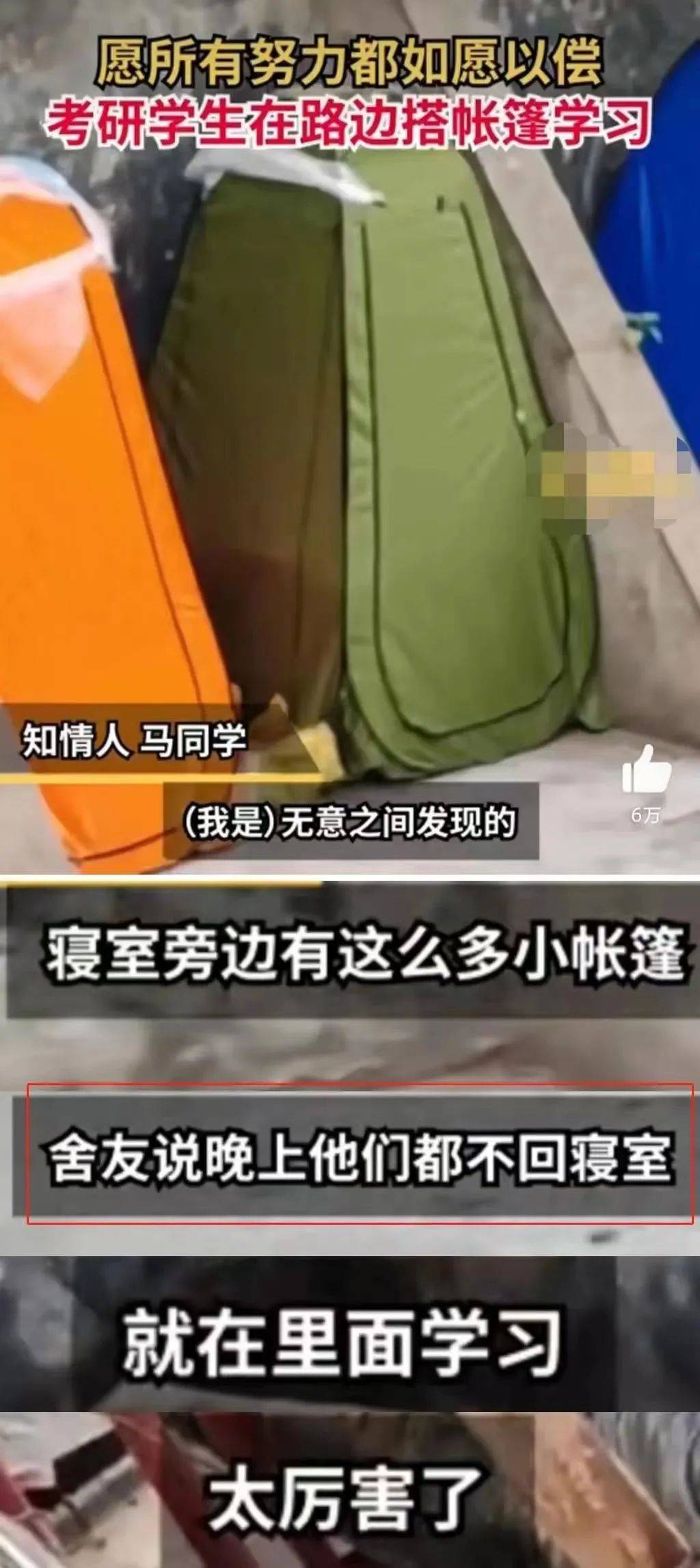 然而在这些说法以外,还有另一种声音回归到了事件本身,那就是—— 为什么要搭帐篷学习?为什么要在楼道里挑灯夜读呢?
