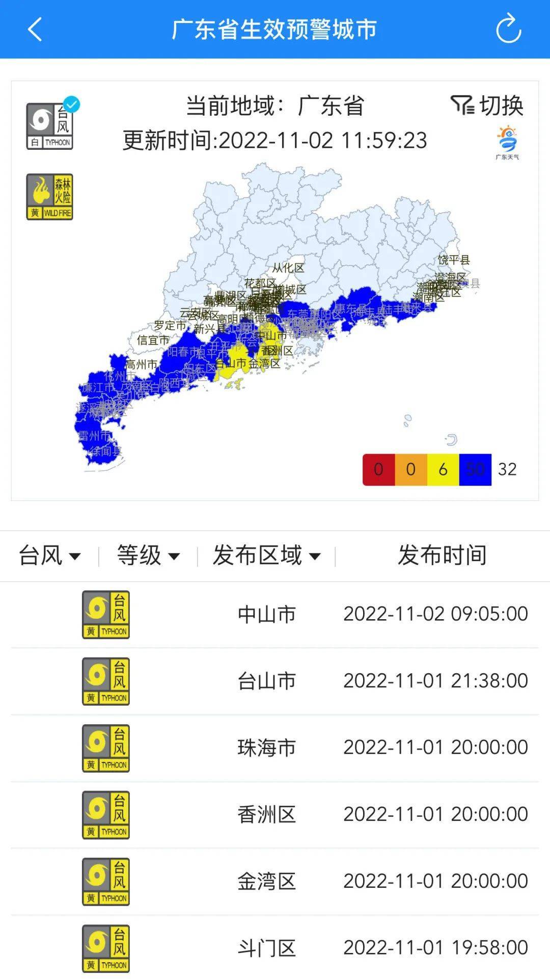 据@中山天气:台风黄色预警信号已于2022年11月2日9时5分生效,全市中小学、托幼(育)机构从今天下午起停课,各类托管中心、教育培训中心参照执行。