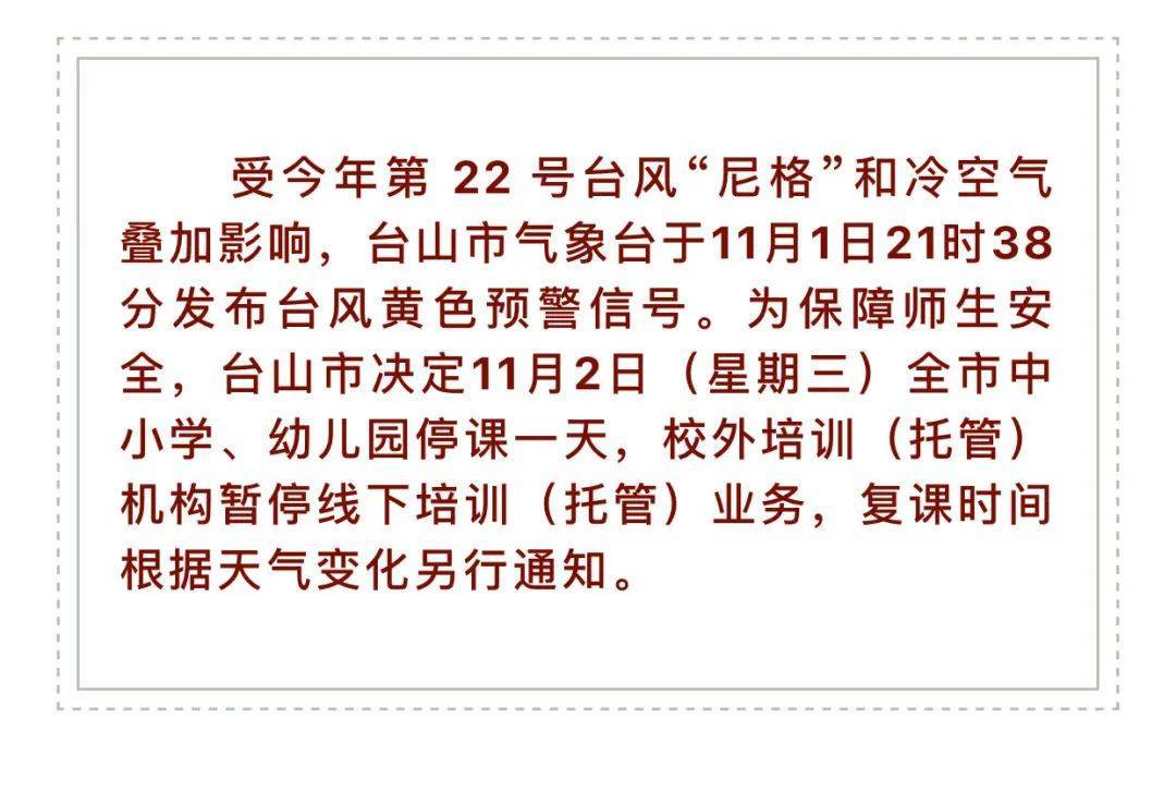 据江门教育局消息,受今年第 22 号台风“尼格”和冷空气叠加影响,台山市气象台于11月1日21时38分发布台风黄色预警信号。台山市决定11月2日(星期三)全市中小学、幼儿园停课一天,校外培训(托管)机构暂停线下培训(托管)业务。