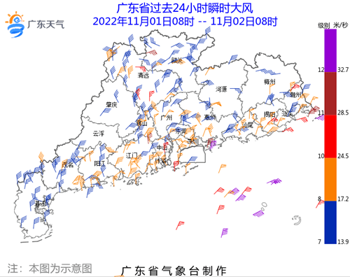 2日,广东省海面、南海北部、台湾海峡风力8级~9级、阵风10级,其中台风中心经过的附近海面旋转风9级~10级、阵风12级;