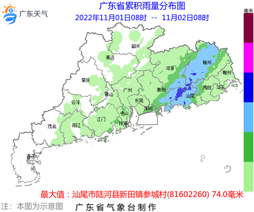 另外, 1日08时-2日08时, 在“尼格”和人工增雨的共同作用下,粤东、梅州、河源、韶关和珠江三角洲南部市县出现了阵雨局部大雨或暴雨,汕尾陆河新田镇录得全省最大雨量74毫米和最大1小时雨量14毫米。