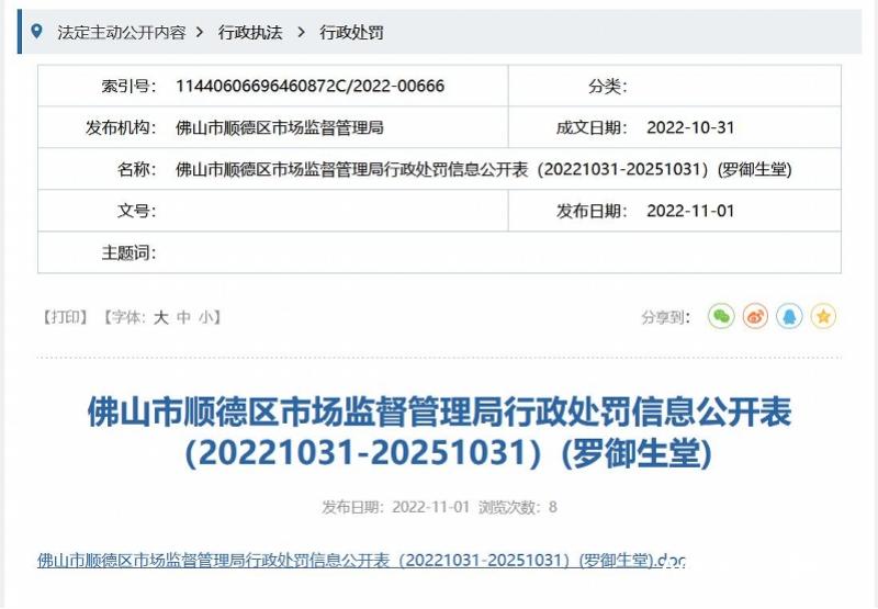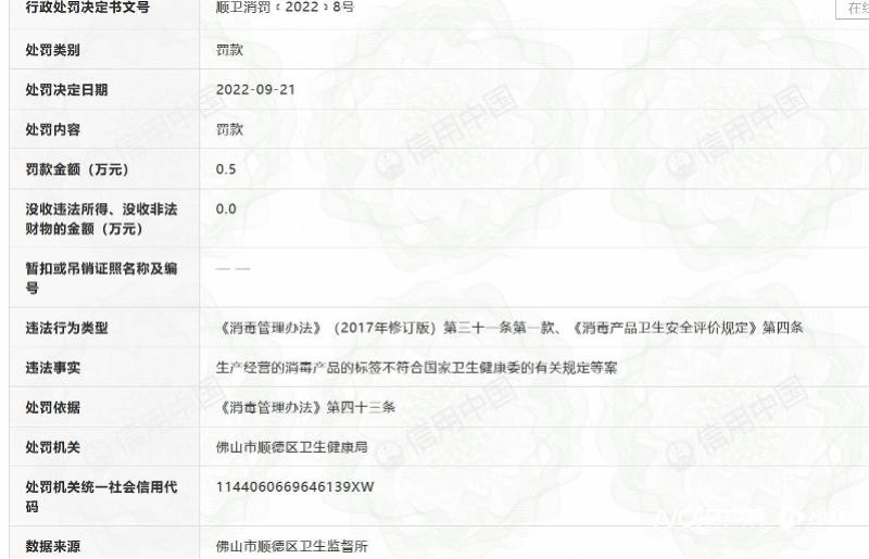 信用中国官网显示,佛山市罗御生堂中医健康科技有限公司成立于2020年12月。今年9月21日,该公司曾因生产经营的消毒产品的标签不符合国家卫生健康委的有关规定等案被佛山市顺德区卫生健康局罚款5000元。