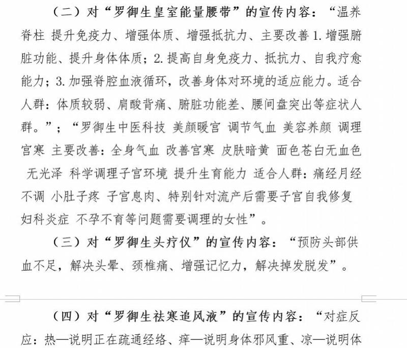 行政处罚决定书显示,经查,佛山市罗御生堂中医健康科技有限公司销售的产品主要有“罗御生能量床(垫)”,另有销售“罗御生腰带”、“罗御生头疗仪”、“罗御生祛寒追风液”、“罗御生参姜汤”。其中,“罗御生能量床垫”、“罗御生腰带”主要部件采用的“能量石”实际为何种物质,该公司无法确认,只能确认该产品是一种通电后使石头发热的家用电器产品,不属于医疗器械。声称“罗御生能量床经过美国FCC检测认证、欧盟CE安全认证”亦为虚构的事实。“罗御生头疗仪”是一种电动震动导流梳,不属于医疗器械。“罗御生祛寒追风液”是一种抑菌液消毒产品,不属于药品。“罗御生参姜汤”是一种普通预包装食品(固体饮料),不属于保健食品。决定书显示,该公司从2021年1月开始销售上述产品,经核算,线下和网络销售总金额共计975000元。