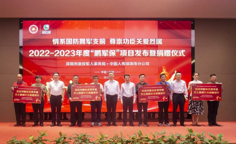 11月1日,深圳市退役军人事务局与中国人寿深圳市分公司(以下简称“深圳国寿”)联合举办2022-2023年度“鹏军保”项目发布暨捐赠仪式,向5400名功臣模范、重点优抚对象及烈士遗属捐赠爱心赠险。深圳市退役军人局局长张悦华、副局长朱锋,深圳国寿总经理陈勋、副总经理周涛出席活动。