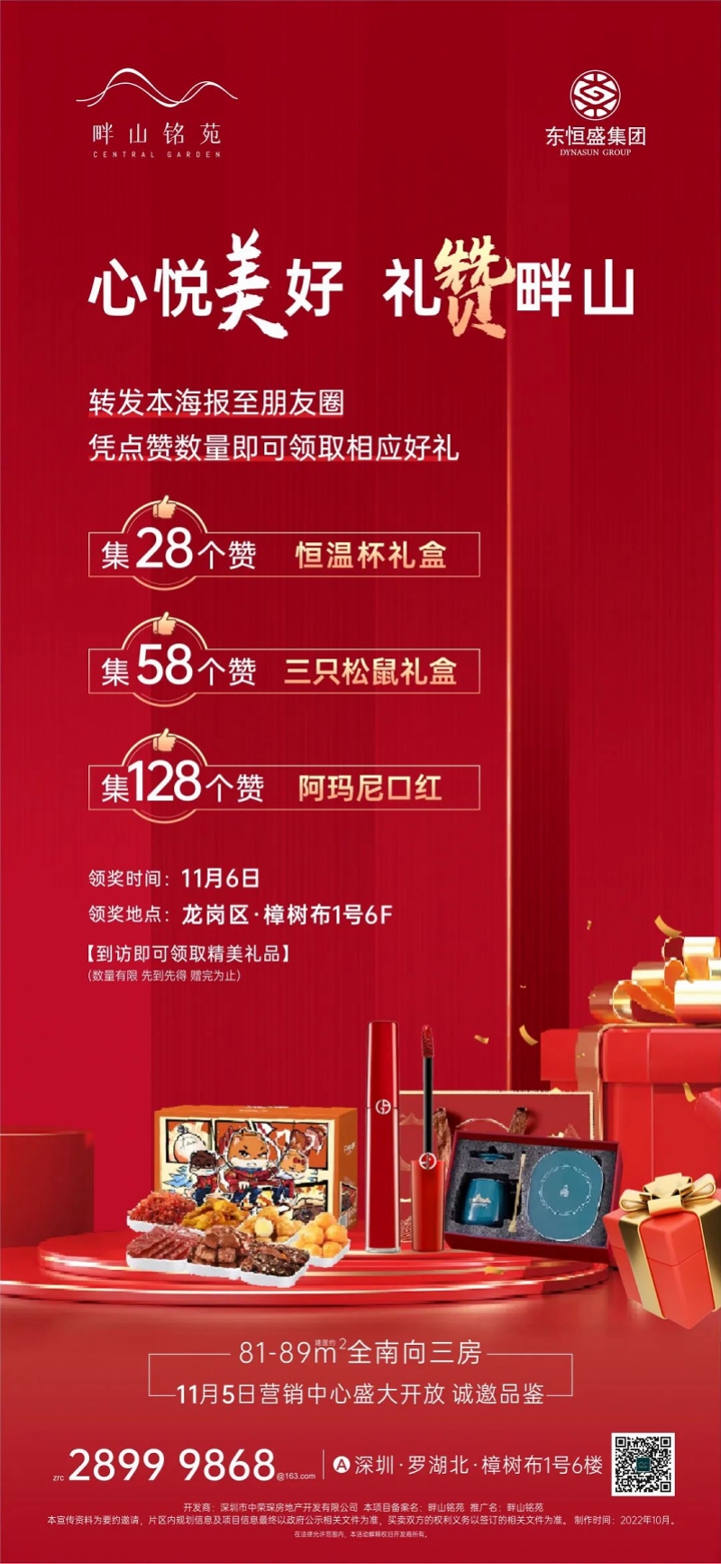 11月5日上午,东恒盛投资集团匠心精筑的作品——畔山铭苑营销中心正式亮相。以崭新的姿态引发全城瞩目,悦鉴美好诗意生活! 活动尚未开始,已有许多客户早早来到现场等候,期待备受关注的【畔山铭苑】正式开放的那一刻。 开放仪式现场,在气势磅礴的舞狮表演中,客户、嘉宾、媒体欢聚一堂,共同见证营销中心的盛大开放。这一刻的美好,让所有等候都不负期待! 各大媒体代表到访 营销中心开放当天,有超百批客户和业界媒体到访亲临现场了解项目,现场销售人员热情的为每位客户及媒体朋友进行讲解。东恒盛集团的实力保障、一站直达罗湖的便捷交通、醇熟的片区配套、全南向三房的户型设计等价值点,纷纷赢得客户及媒体的高度认可。 东恒盛集团布局全国 东恒盛投资集团成立于1999年,在地产、酒店、矿业三大支柱多元化发展,具备16年五星级商旅标杆开发及管理经验,和10年综合社群孵化及运营。2009年起深耕珠三角,布局全国,开发了一批精品项目。 现战略布局深圳,匠心精著畔山铭苑,圆满深圳奋斗者的安家梦,筑就城市美好人居。 畔山铭苑区位示意图 畔山铭苑多维交通赋能,樟树布社区站16条公交线路,1站直达罗湖,方便日常出行。邻近地铁17号线南岭站(规划中),还有3号线丹竹头站在旁,无忧贯通全城。综合交通枢纽深圳东站、高铁罗湖北站(建设中)也近在左右,更享多条高速,以全方位立体交通网络,快速接驳湾区。 淘金山绿道实景图 约200米直线距离到淘金山绿道,沿线共13个景观节点,起于翠湖社区公园,终至沙湾路,分为映彩华章、山林野趣、山湖叠翠和绿廊揽胜四个主题段,可俯揽深圳水库、远眺梧桐山。近邻求水山公园、樟树布公园,举步自然的浓荫谧静,成为家人休闲栖息目的地。 项目商业街效果图 项目自带漫步式繁华商业,周边3.5km内约30万㎡璀璨商圈环伺,坐享繁华城央生活。南岭小学、沙湾中小学、布吉高级中学等优质学校簇拥,一站式菁英教育,助力孩子远大未来。更有龙岗第四人民医院等优质医疗配套,为家人健康生活保驾护航。 约89㎡户型效果图 畔山铭苑精心打造约81-89㎡全南向3房,难得一见的南北通透精致小户型,且2梯4户享超高实用率,拥享阳光清风登堂入室。同步规划多维全龄社区,全龄生活剧场、童趣乐岛、半廊花院、星耀广场,满足每一位家人的社交休闲生活需求。 畔山铭苑效果图 畔山铭苑,为圆满深圳置业梦而来 与幸福共成长 畔山铭苑营销中心 现已风华启幕,恭迎赏鉴 11月6日来访营销中心 更可参与集赞赢好礼活动 点击保存海报发布至朋友圈 满28个赞即可领取恒温杯礼盒 满58个赞即可领取三只松鼠礼盒 满128个赞即可领取阿玛尼口红 数量有限,先到先得 满满福利千万别错过哦! 免责提示: 开发商:深圳市中荣琛房地产开发有限公司 本项目备案名:畔山铭苑 推广名:畔山铭苑 本宣传资料为要约邀请,学区划分及入学政策,以教育局及学校规定为准,片区内规划信息及项目信息最终以政府公示相关文件为准,买卖双方的权利义务以签订的相关文件为准。