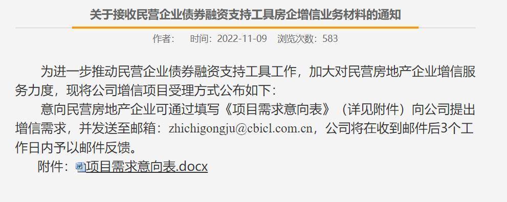 通知显示,为进一步推动民营企业债券融资支持工具工作,加大对民营房地产企业增信服务力度,意向民营房地产企业可通过填写《项目需求意向表》向中债信用增进公司提出增信需求,公司将在收到邮件后3个工作日内予以邮件反馈。