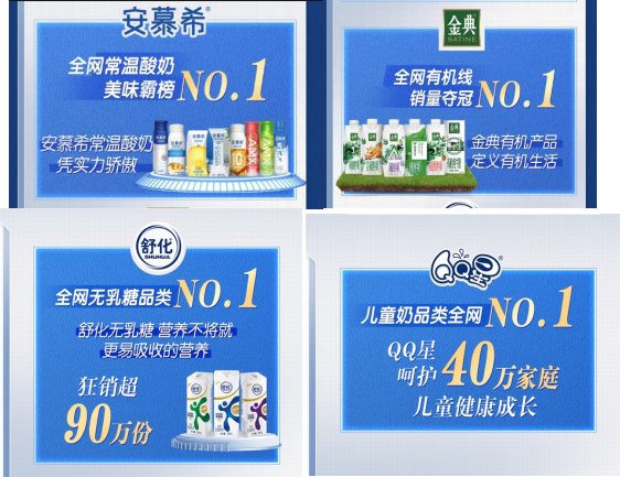 双十一期间,伊利安慕希、金典有机线、舒化牛奶、QQ星儿童牛奶等持续荣膺全网常温酸奶、有机线、无乳糖品类、儿童奶品类第一。