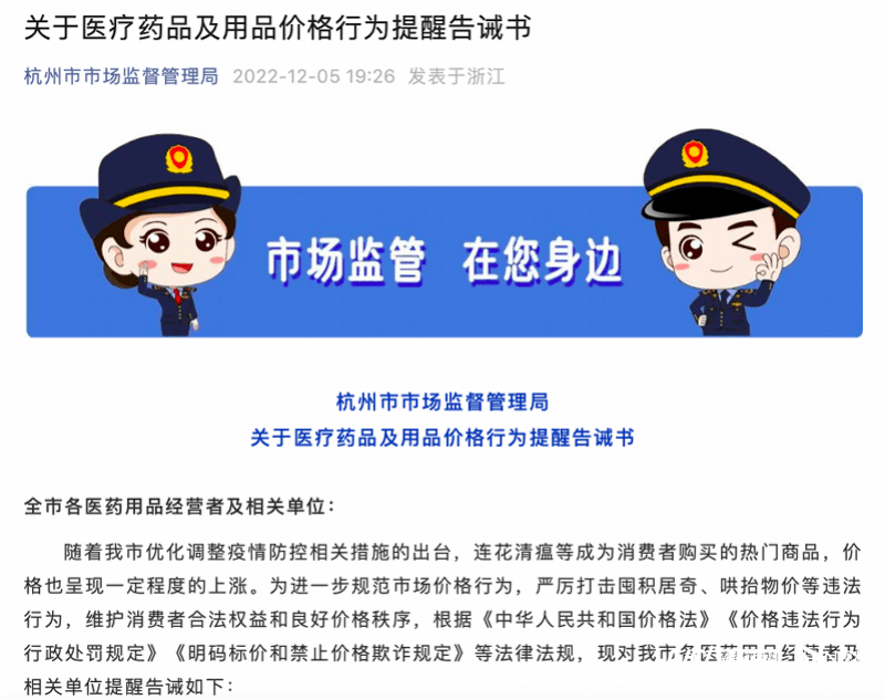南都记者注意到,12月5日, 北京、杭州等多地市场监管部门发布关于医疗药品及用品价格行为提醒告诫书,称将严厉打击囤积居奇、哄抬物价等违法行为。