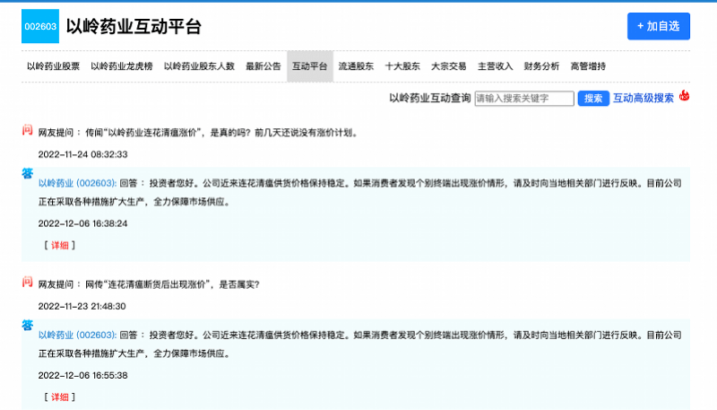 针对“连花清瘟断货后出现涨价”传闻,以岭药业于12月6日下午在投资者互动平台回应,公司近来连花清瘟供货价格保持稳定。如果消费者发现个别终端出现涨价情形,请及时向当地相关部门反映。目前公司正在采取各种措施扩大生产,全力保障市场供应。