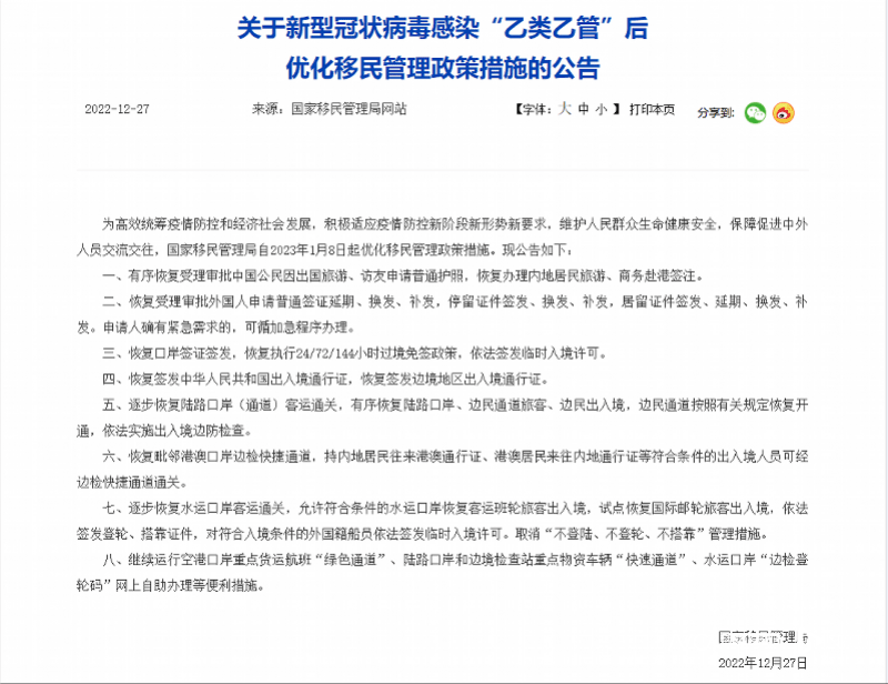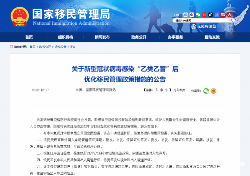 12月27日,国家移民管理局官网发布《关于新型冠状病毒感染“乙类乙管”后优化移民管理政策措施的公告》,表示“自2023年1月8日起优化移民管理政策措施。”