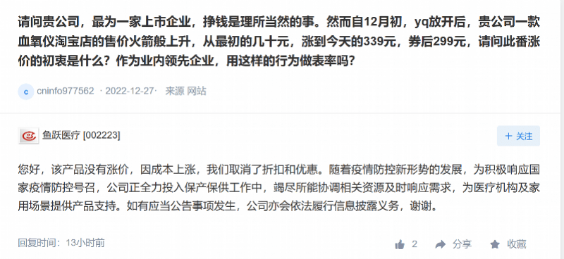 鱼跃医疗称,公司生产经营合法合规,目前血氧仪产品没有涨价,因成本上涨,取消了折扣和优惠。随着疫情防控新形势的发展,为积极响应国家疫情防控号召,公司正全力投入保产保供工作中,竭尽所能协调相关资源及时响应需求,为医疗机构及家用场景提供产品支持。