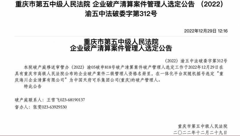 日前,重庆市第五中级人民法院发布了中国天府可乐集团公司(重庆)破产清算公告,公告显示,天府可乐集团破产清算一案过程中采取随机摇号方式产生破产管理人,并最终选定“重庆海川企业清算有限公司”为破产管理人。根据天府可乐集团递交的资产负债表显示,截至2022年4月30日,其资产总计264.68万元,负债总计3366.96万元。