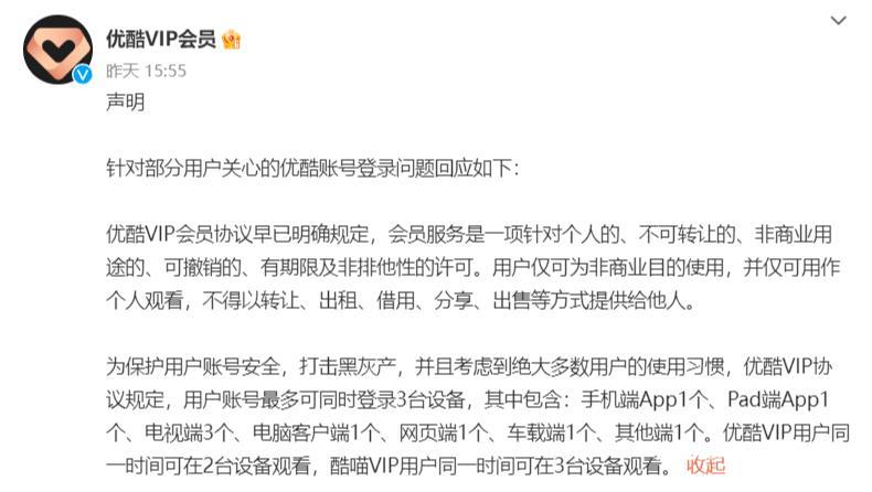 据悉,“优酷VIP会员”在微博发布的声明称,优酷VIP会员协议早已明确规定,会员服务是一项针对个人的、不可转让的、非商业用途的、可撤销的、有期限及非排他性的许可。用户仅可为非商业目的使用,并仅可用作个人观看,不得以转让、出租、借用、分享、出售等方式提供给他人。为保护用户账号安全,打击黑灰产,并且考虑到绝大多数用户的使用习惯,优酷VIP协议规定,用户账号最多可同时登录3台设备,其中包含:手机端App1个、Pad端App1个、电视端3个、电脑客户端1个、网页端1个、车载端1个、其他端1个。优酷VIP用户同一时间可在2台设备观看,酷喵VIP用户同一时间可在3台设备观看。