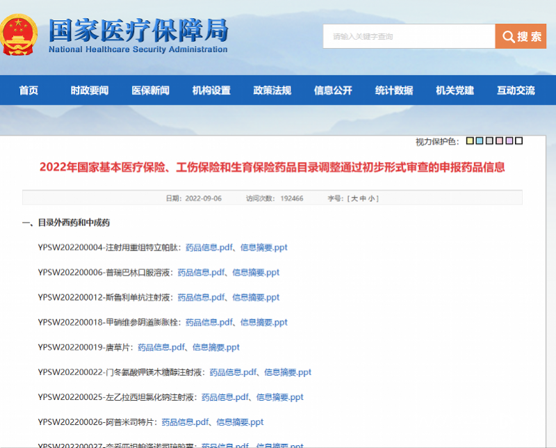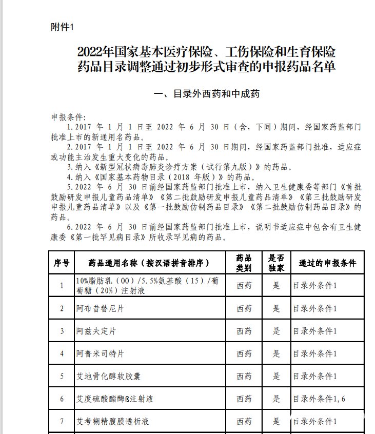 2022年国家基本医疗保险、工伤保险和生育保险药品目录调整通过初步形式审查的药品名单