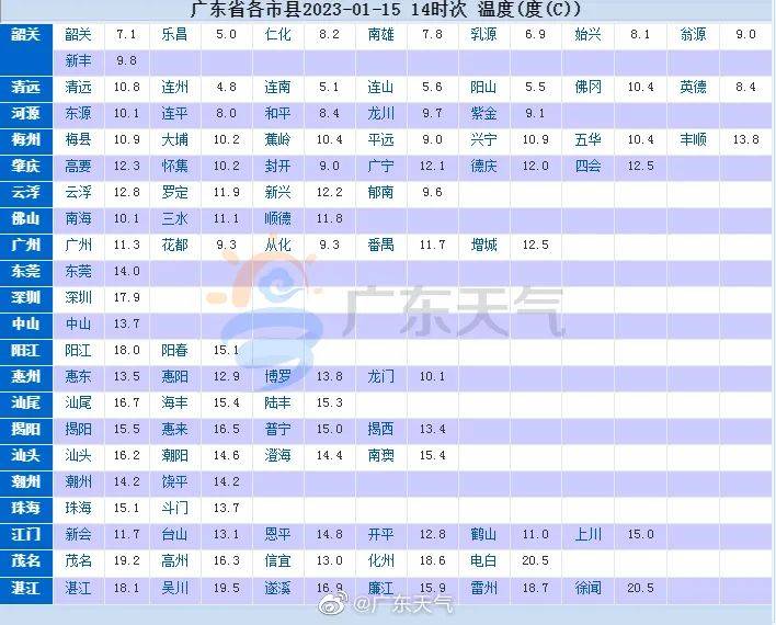 16日,广东大部分市县分散小雨转多云。粤北和珠三角北部市县有5℃及以下低温,粤北山区有冰冻。最低气温:粤北的偏北市县零下1℃~2℃(高寒山区零下3℃~零下1℃),南部市县7℃~11℃,其余市县3℃~7℃。
