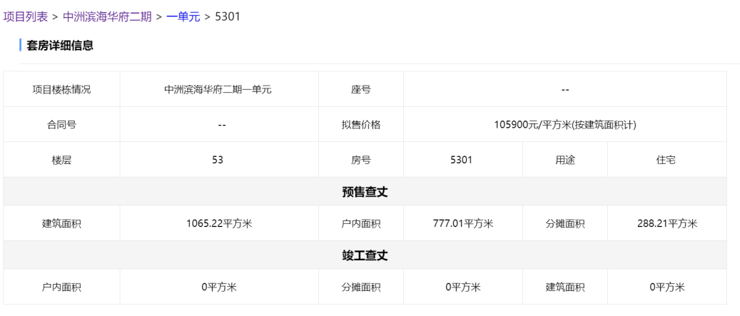 南都·湾财社记者注意到,大户型均分布在一单元,其中260多平的住宅为一层两户,527㎡的住宅分布在47层以上,共6套为一梯一户;而1065㎡的超大平层住宅位于顶层的53楼,备案房源仅有1套,总价超过1个亿。