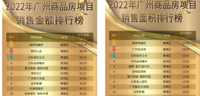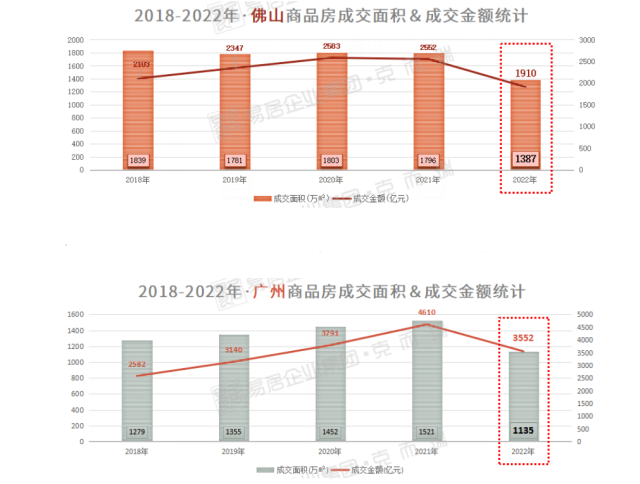各大机构统计的2022年各城市商品房成交数据已陆续出炉。克而瑞统计显示,广州和佛山2022年商品房市场销售承压明显,广州成交额虽然达到过去五年来的第三高,但成交面积却是五年来最低,其中佛山成交金额和成交面积均创下五年来的新低。
