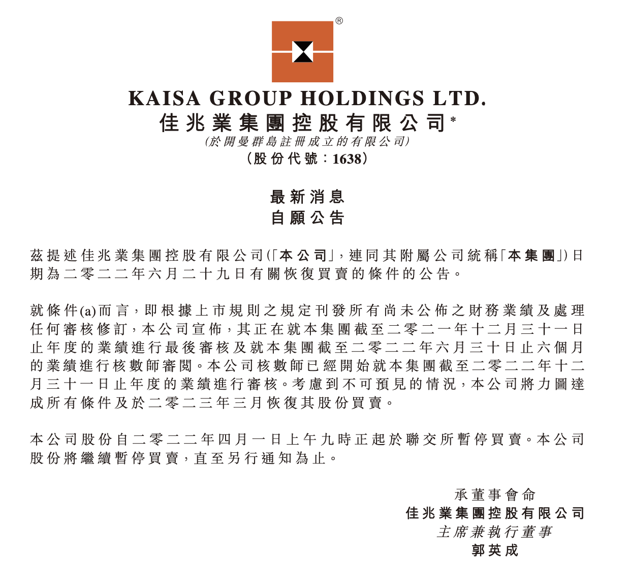 1月30日,佳兆业集团控股有限公司(下称“佳兆业”,01638.HK)发布公告称,考虑到不可预见的情况,公司将力图达成所有条件及于2023年3月恢复股份买卖。