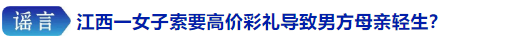 真相:近日,有网民发视频称,“江西一女子要88万彩礼,男方家中拿不出来只能由父母去借。由于彩礼借不到,男方妈妈就寻了短见”。对此,江西乐平警方辟谣称,经公安机关核实,该视频系造谣。同时,原视频发布者也对此事进行澄清,表示所谓“88万彩礼”一事系自己道听途说,“我也是听到别人讲的,不真实的,请你们不要转发了。”(来源:中国青年报)