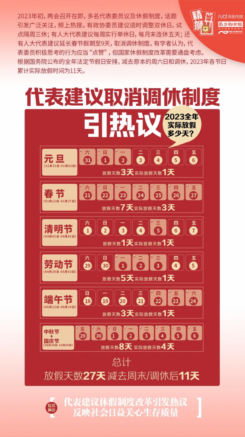 2023年全国两会召开在即,多名全国人大代表议及休假制度改革,希望延长法定节假日、增设假期,甚至取消调休制度,其中部分代表尤其关心春节假期。