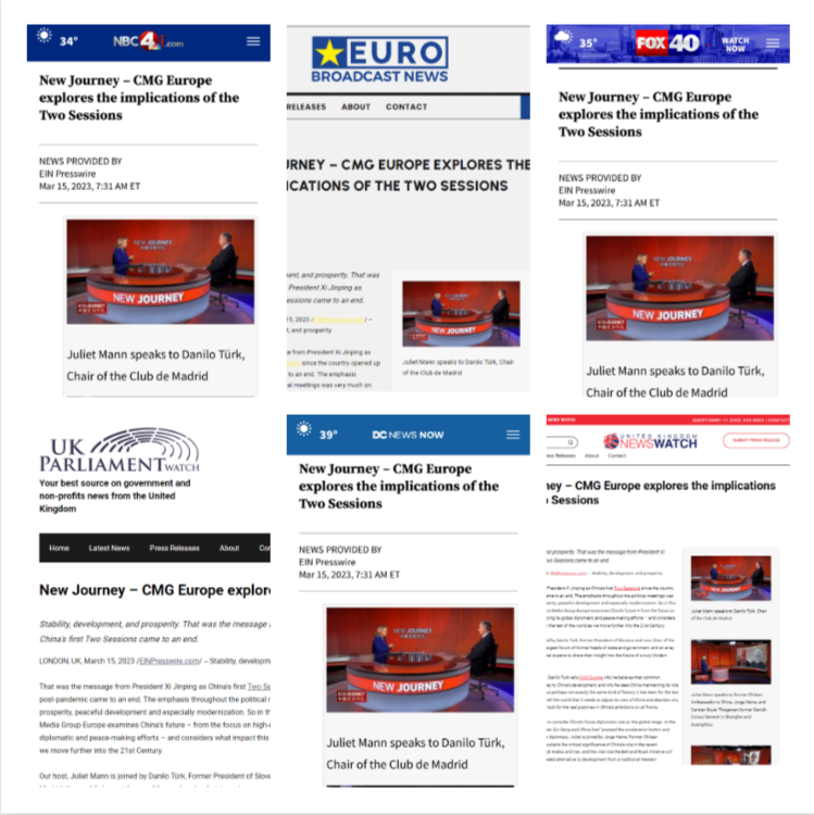 “中国式现代化与世界新机遇”欧洲专场研讨会暨特别节目在总台CGTN多平台播出。美联社、美国全国广播公司、美国哥伦比亚广播公司、美国广播公司、美国福克斯电视台、英国新闻电讯、欧洲每日报道、英国媒体观察、英国议会观察等近300家欧美主流媒体转载报道,触达受众1.5亿人次。