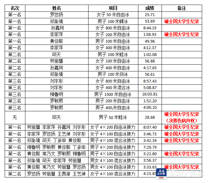 其中,在8项接力项目中,深圳大学游泳队获7金1银,并打破女子4×200自由泳接力、女子4×100自由泳接力、男子4×100混合泳接力、男子 4×100自由泳接力、男女4×100自由泳接力项目的赛会纪录;个人项目中,郑枭境以53秒69的成绩打破男子 100米蝶泳赛会纪录,李家萍以1分58秒93的成绩打破女子200米自由泳项目赛会纪录,邱天以28秒68的成绩打破男子50米蛙泳项目赛会纪录。
