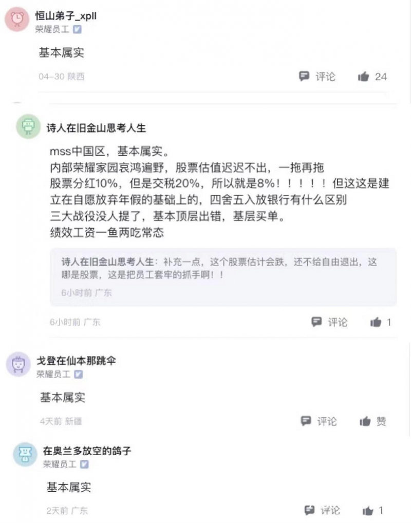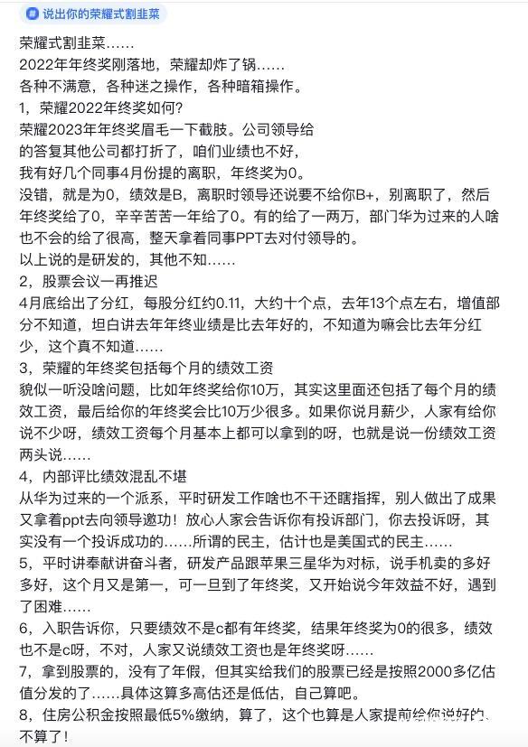 日前,南都湾财社记者在职言平台看到,有网友爆料称,荣耀个别部门2022年年终奖大幅缩水,甚至出现“打骨折”的情况,此外股票会议也在推迟。相关发帖下,有多位实名认证为荣耀员工的账号表示情况基本属实。