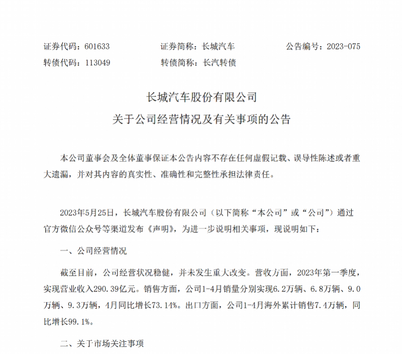 5月25日晚间,长城汽车(601633.SH)再发一则公告,表明“涉及事项为公司日常经营中的相关事项”,并“将按照法律法规和上市规则等要求及时履行信息披露义务”。