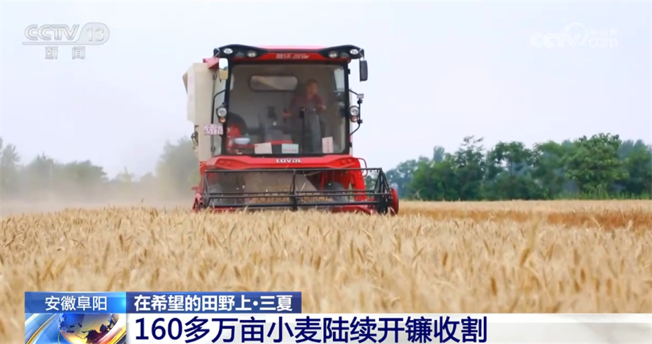 在安徽阜阳的临泉县,160多万亩小麦迎来丰收,大型联合收割机穿梭在金黄的麦田中。在阜阳市临泉县吕寨镇,一行行麦穗被卷入收割机,收割、脱粒、除杂一气呵成,实现颗粒归仓。