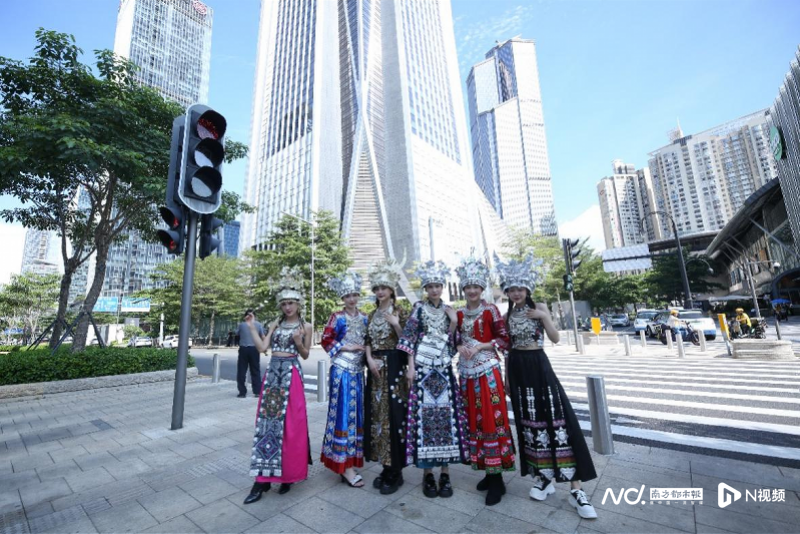 表演过后,苗家少女还走上了深圳街头展示苗族的风情,来了一场深圳摩天大楼与苗族时尚风情的混搭,惊艳路人。
