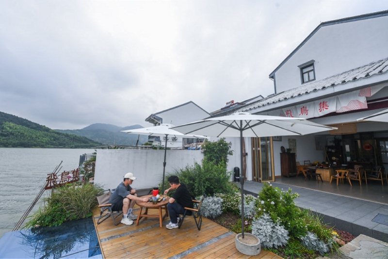 6月12日,游客在慈溪市观海卫镇双湖村的一家茶室喝茶聊天,双湖村是一个坐拥三山两湖的江南典型村落,东靠杜湖,南邻白洋湖。近年来,双湖村努力打造成为独具农文融合的古村旅游目的地。该村获得第七批中国历史文化名镇古村、浙江省美丽宜居村、浙江省美丽乡村特色精品村、浙江省3A景区村等荣誉。