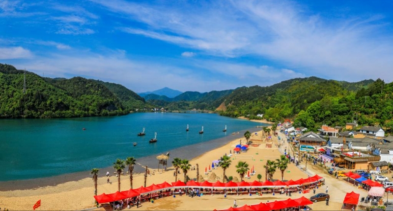 2016年,云和县石塘镇长汀村落实“山里看海”创意,将曾经内湖荒滩上的30多个鸭棚和旱厕拆掉,海运来1万多吨沙子,并配套建好步栈道、种上椰子树,荒滩变为金色沙滩。长汀村旅游一下火爆起来。
