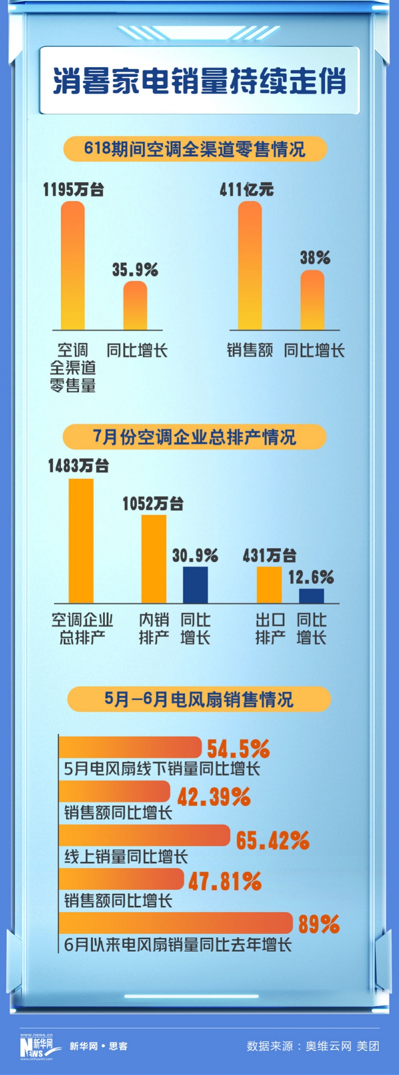 在持续的高温天气下,空调市场需求不断高涨,企业销售预期增强。据奥维云网最新排产数据显示,目前7月份空调企业总排产1483万台,其中内销排产1052万台,同比增长30.9%;出口排产431万台,同比增长12.6%。