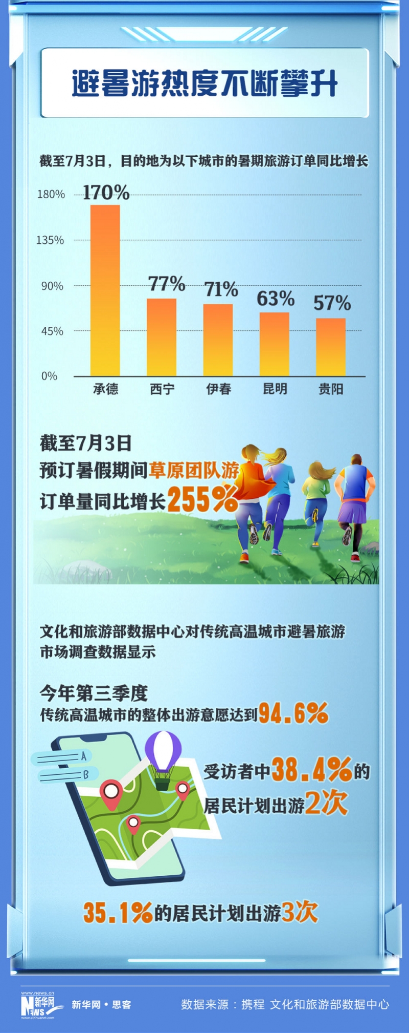 文化和旅游部数据中心不久前对传统高温城市避暑旅游市场调查数据显示,今年第三季度传统高温城市的整体出游意愿达到94.6%,受访者中38.4%的居民计划出游2次,35.1%的居民计划出游3次。