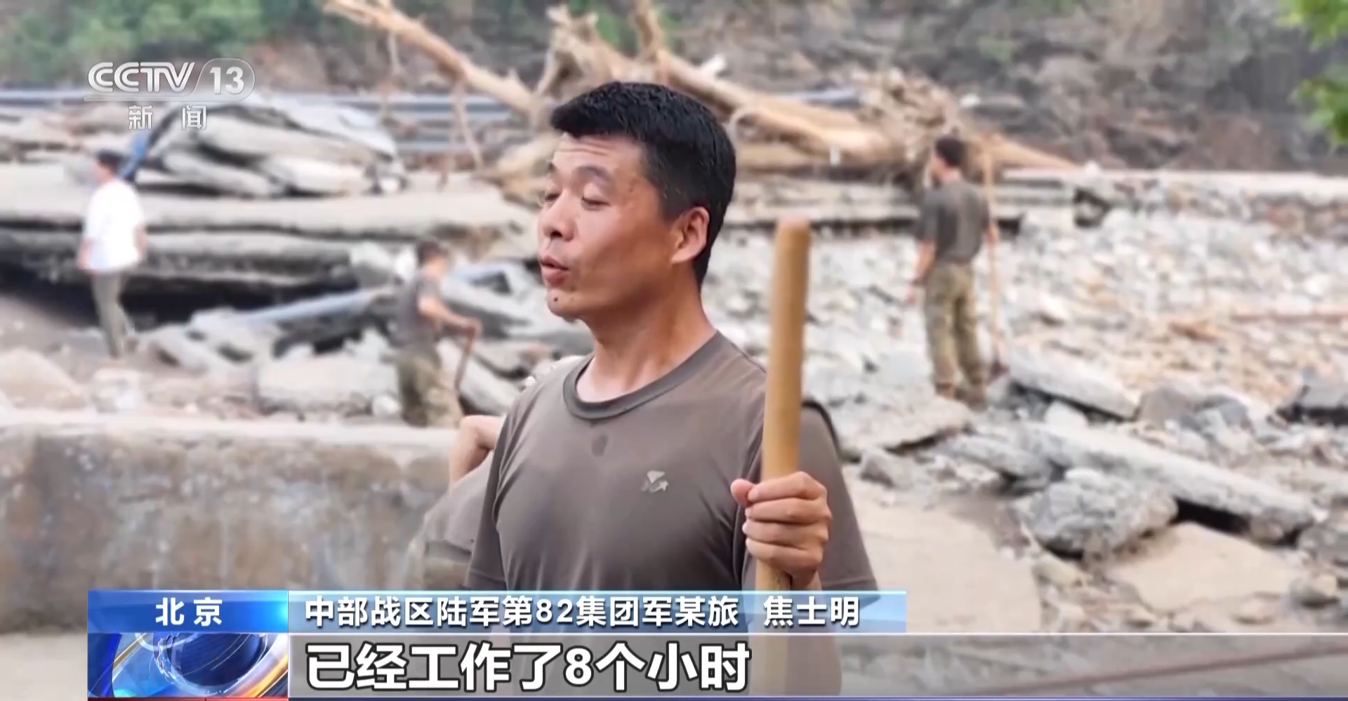 中部战区陆军第82集团军某旅 焦士明:从早上6点出来到现在已经工作了8个小时,每次听见群众说解放军来了心里就踏实了,就感觉这身军装意义重大,我相信在战友们的共同努力下,我们一定能够高标准完成这次救灾任务。