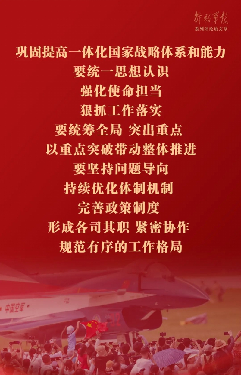 巩固提高一体化国家战略体系和能力,是党中央把握强国强军面临的新形势新任务新要求,着眼于更好统筹发展和安全、更好统筹经济建设和国防建设作出的战略部署。要统一思想认识,强化使命担当,狠抓工作落实,努力开创一体化国家战略体系和能力建设新局面。关键是要在一体化上下功夫,实现国家战略能力最大化。要统筹全局,突出重点,以重点突破带动整体推进。必须向改革创新要动力,要坚持问题导向,持续优化体制机制,完善政策制度,形成各司其职、紧密协作、规范有序的工作格局,更好推进一体化国家战略体系和能力建设。