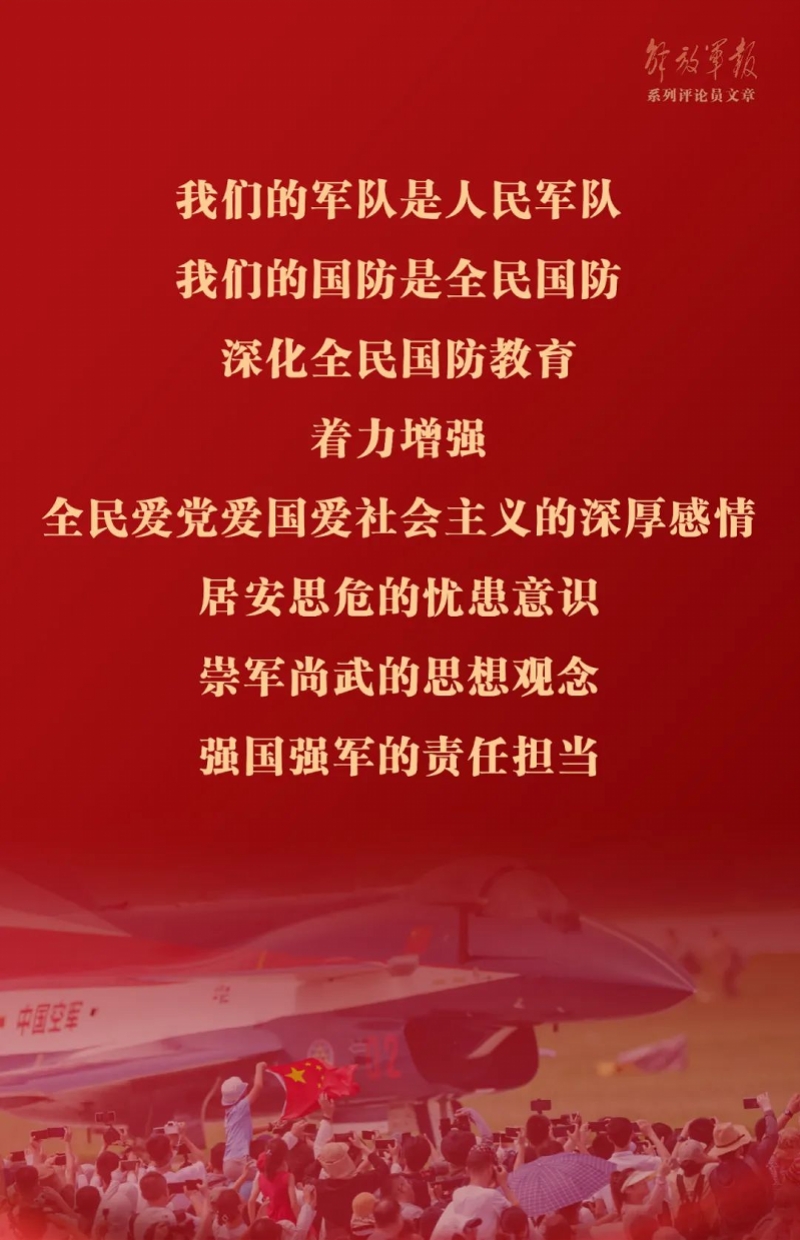 我们的军队是人民军队,我们的国防是全民国防。深化全民国防教育,着力增强全民爱党爱国爱社会主义的深厚感情、居安思危的忧患意识、崇军尚武的思想观念、强国强军的责任担当。加强国防动员和后备力量建设,推进现代边海空防建设,发挥党政军警民合力强边固防的独特优势,筑牢边海防铜墙铁壁,坚持人民防空为人民,铸就坚不可摧的护民之盾。加强军人军属荣誉激励和权益保障,做好退役军人服务保障工作,让军人成为全社会尊崇的职业。