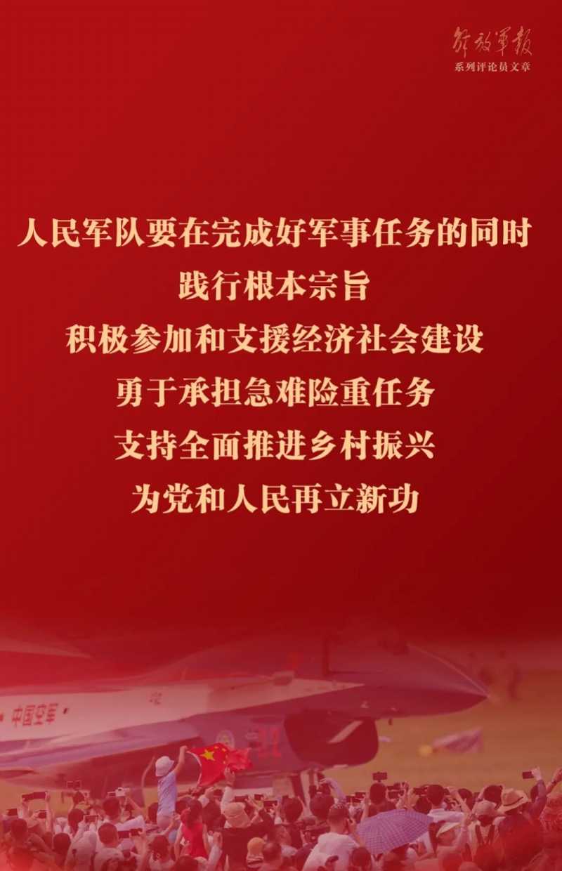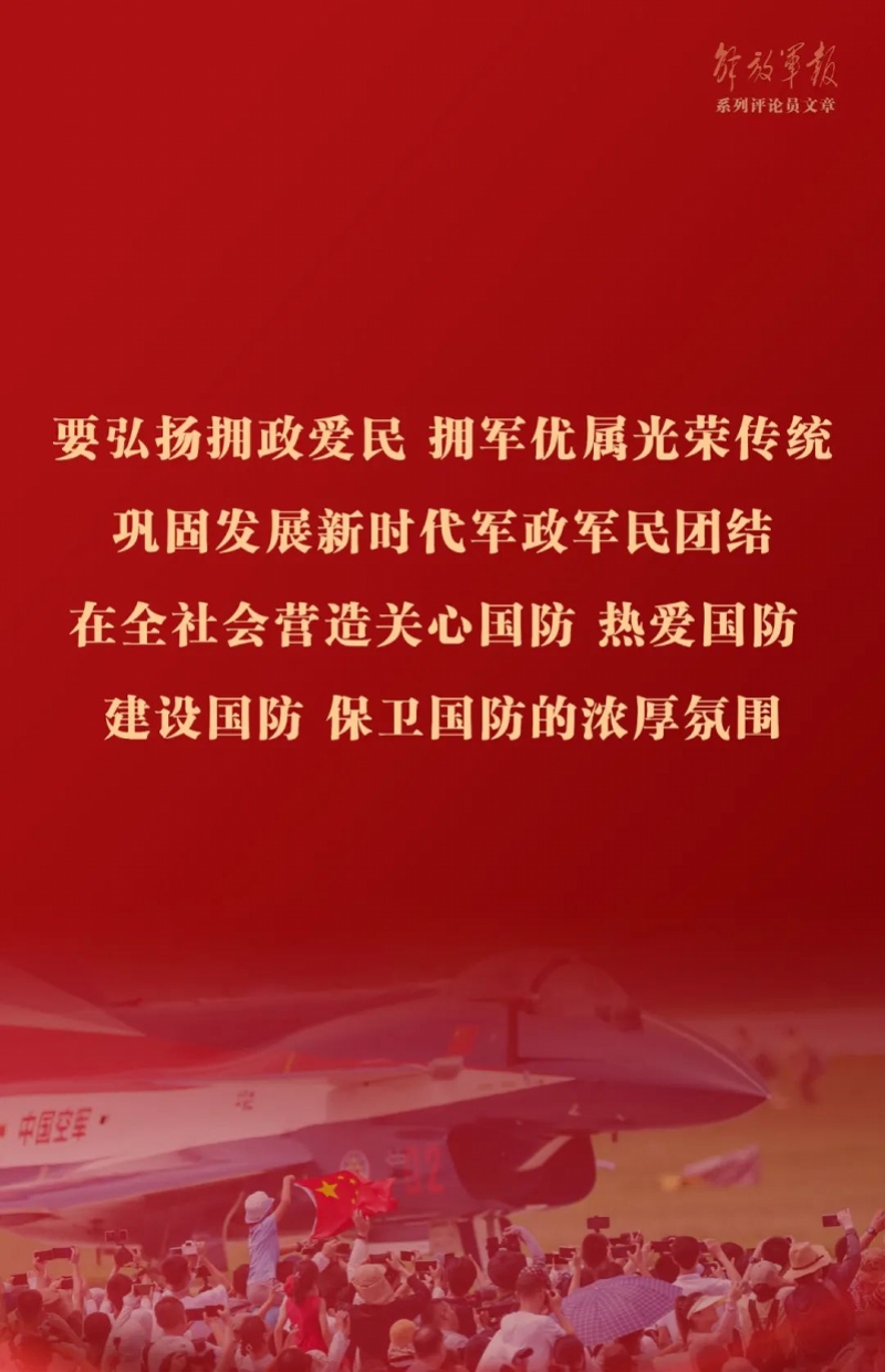 军政军民团结是实现富国和强军相统一的重要政治保障,是我们党和国家的显著政治优势。要弘扬拥政爱民、拥军优属光荣传统,巩固发展新时代军政军民团结,在全社会营造关心国防、热爱国防、建设国防、保卫国防的浓厚氛围,为巩固提高一体化国家战略体系和能力、为推进强国强军汇聚强大力量。人民军队要在完成好军事任务的同时,践行根本宗旨,积极参加和支援经济社会建设,勇于承担急难险重任务,支持全面推进乡村振兴,为党和人民再立新功。