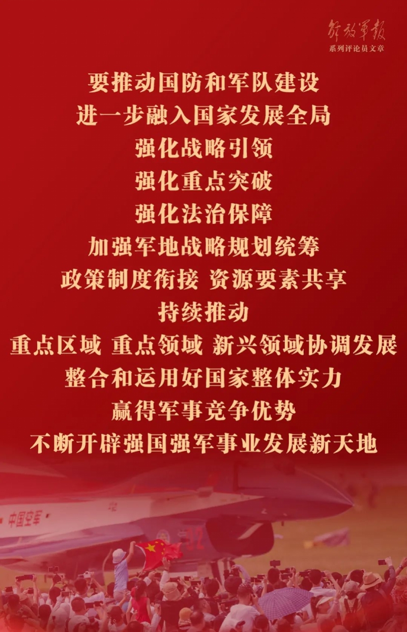 党的二十大描绘了强国建设、民族复兴的宏伟蓝图,对巩固提高一体化国家战略体系和能力作出战略部署。要推动国防和军队建设进一步融入国家发展全局,强化战略引领,强化重点突破,强化法治保障,加强军地战略规划统筹、政策制度衔接、资源要素共享,持续推动重点区域、重点领域、新兴领域协调发展,整合和运用好国家整体实力,赢得军事竞争优势,不断开辟强国强军事业发展新天地。