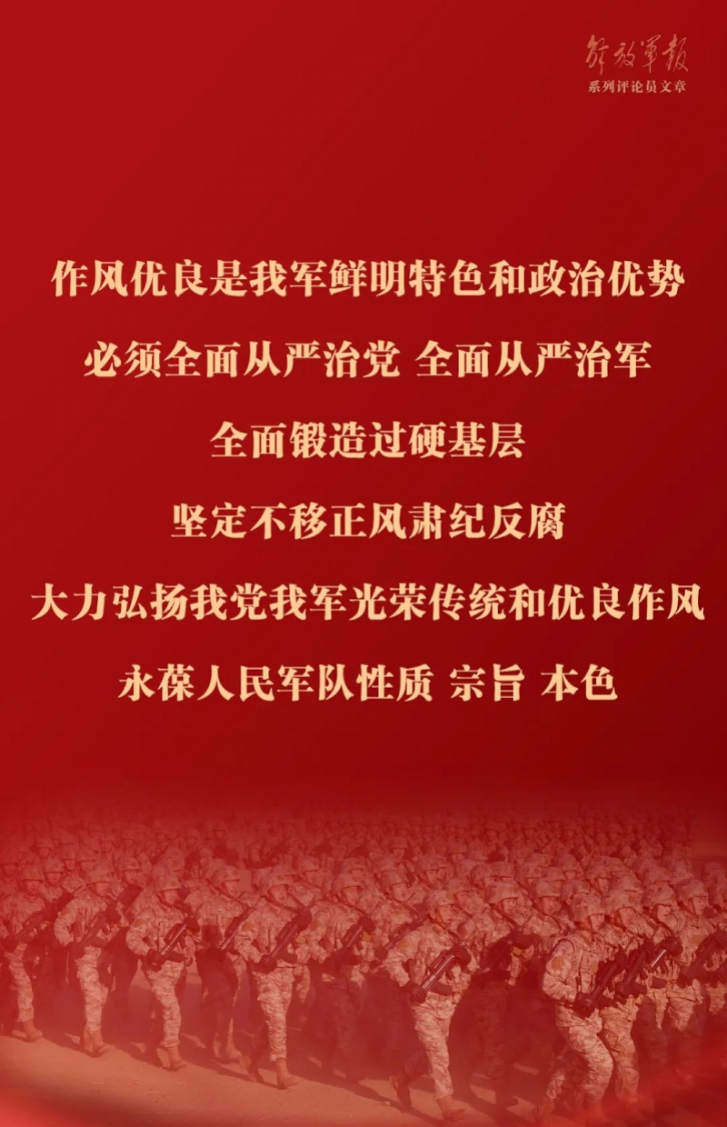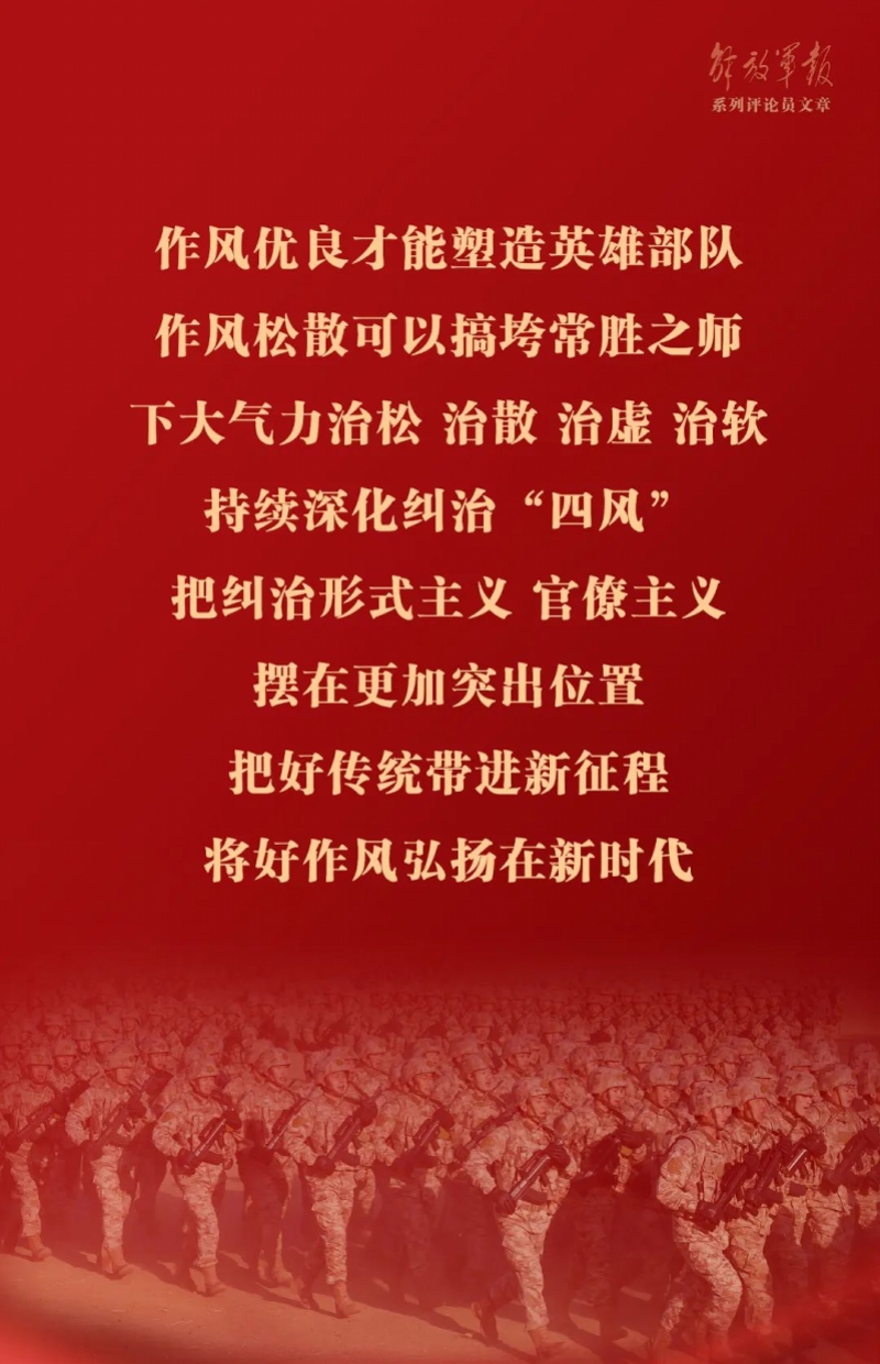 古往今来,作风优良才能塑造英雄部队,作风松散可以搞垮常胜之师。必须把作风建设作为军队一项基础性长期性工作抓紧抓实,下大气力治松、治散、治虚、治软,永葆人民军队政治本色。要持续深化纠治“四风”,继续纠治享乐主义、奢靡之风,抓住普遍发生、反复出现的问题深化整治,坚决防反弹回潮、防隐形变异、防疲劳厌战;把纠治形式主义、官僚主义摆在更加突出位置,作为作风建设的重点任务,科学精准靶向整治,动真碰硬、务求实效,把好传统带进新征程,将好作风弘扬在新时代。